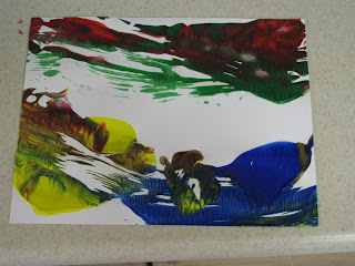 I've been a little bored with our regular painting routine lately and decided it was time to shake things up a bit. I started by putting four blobs of paint on an old cookie sheet: